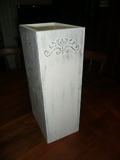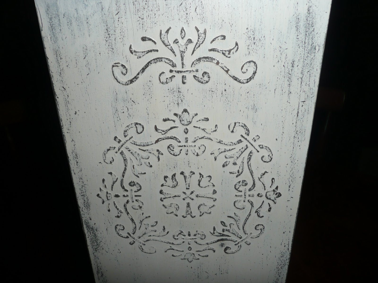 gave First 2 coats of acrylic color burnt sienna, then as I wanted to have some relief, I spent fillings with a plastic spatula, which is used to plug the holes in the walls, mixed with a little sienna on a stencil. when it dried, I rubbed a candle common used when cutting light, rubbed over the surface as if painting with a pencil, always to the same side (it is very important because if not then it shows. After I painted with acrylic white, to which I added a very small droplet of the Siena, just, only that it is not white so tight when it dried I sanded it's also always on the same side as I went sailing, more sanding sectors I wanted to stay more worn, and this was the result